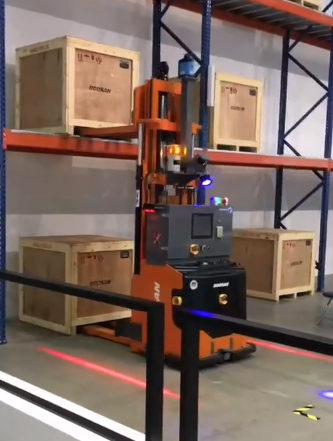 Reach truck AGV can be applied to the automatic handling of pallet with cargo at different altitudes, with a load of up to 1.5 tons. The biggest advantage is the stability of high-level handling. The standard access height can reach 5.7 meters and the maximum access height can reach 8-9 meters. With a comprehensive and complete safety protection mechanism, it can achieve all-directional protection in driving direction, fork movement direction and side steering direction.
